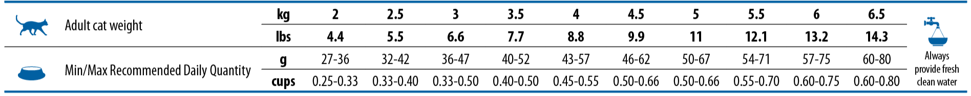 Additifs nutritionnels: Vitamine A 16000UI; Vitamine D3 1600UI; Vitamine E 160mg; Vitamine C 160mg; Niacine 40mg; D- pantothénate de calcium 16mg; Vitamine B2 8mg; Vitamine B6 6.4mg; Vitamine B1 4.8mg; Biotine 0.4mg; Acide folique 0.48mg; Vitamine B12 0.06mg; Chlorure de coline 2500mg; Zinc (oxyde de zinc): 86.7mg; Zinc (sulfate de zinc monohydraté): 43.7mg; Manganèse (sulfate manganeux monohydraté): 48.8mg; Fer [sulfate de fer (II) monohydraté]: 14.5mg; Fer [carbonate de fer (II)]: 28.9mg; Cuivre [sulfate de cuivre(II) pentahydraté]: 12.8mg; Iode (Iodate de calcium anhydre): 1.56mg; Sélénium (sélénite de sodium): 0.101mg; DL-méthionine, techniquement pure 3000mg; Taurine 1800mg; L-carnitine 250mg. Additifs sensoriels : extrait de thé vert 100mg; extrait de romarin. Antioxydants : extraits de tocophérols tirés d’huiles végétales.
